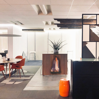 This start up had a small budget to transform their generic looking office into something interesting and fun. We removed part of the carpet squares to break up the space, installed some screen walls and added their branding everywhere. We painted geometric patterns on the walls and posts, built shelving and added LED strip lighting everywhere.